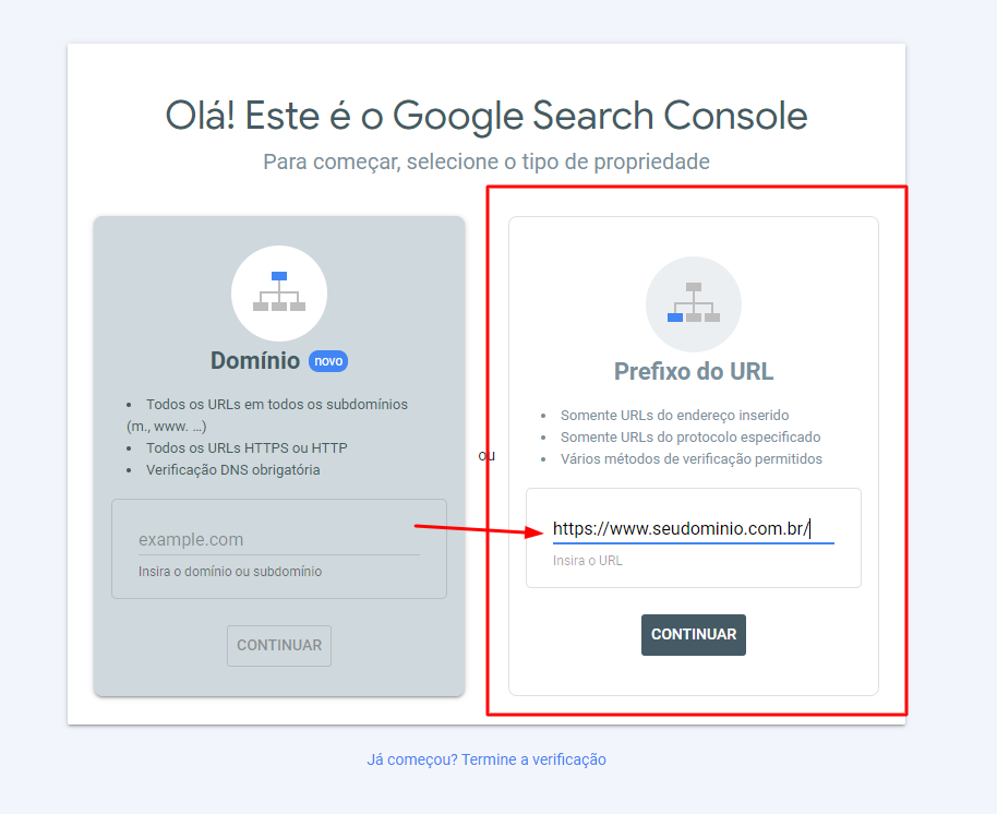 Selecione a opção Prefixo do URL, informe o seu domínio completo (exemplo: https://www.seudominio.com.br/) e clique botão CONTINUAR.