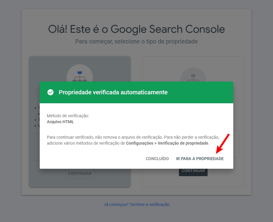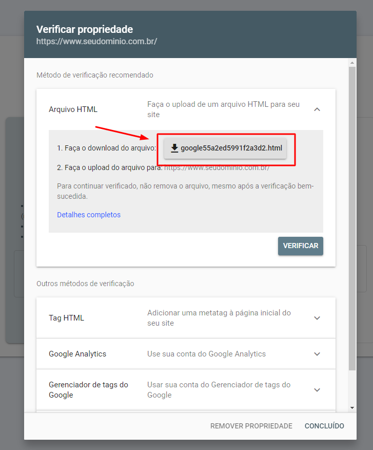Em seguida, clique no link de download do arquivo de verificação HTML e salve-o no seu computador.