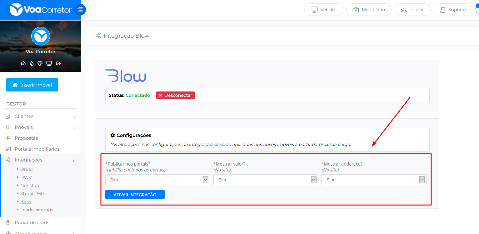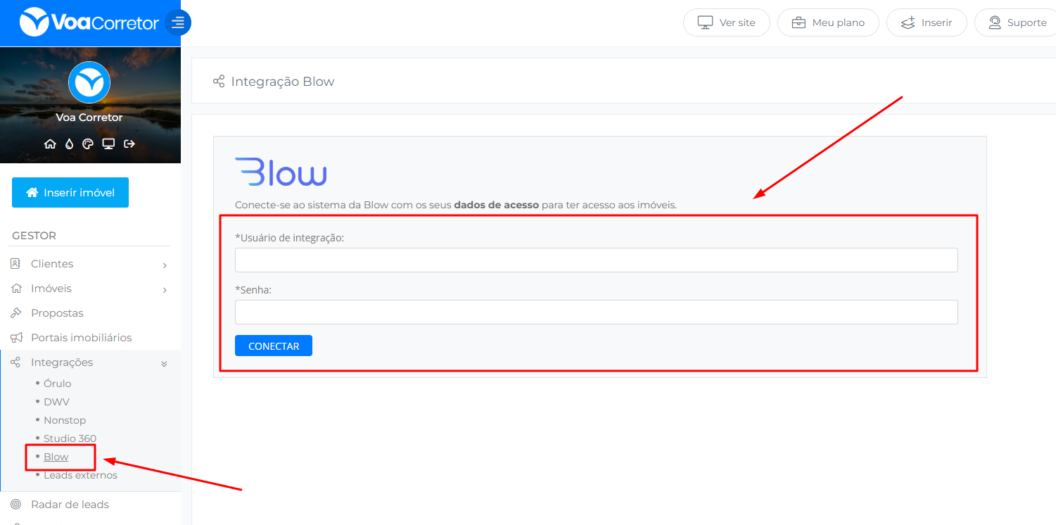 Com essas informações em mãos, acesse o seu painel do Voa Corretor e vá até o menu Integrações > Blow.