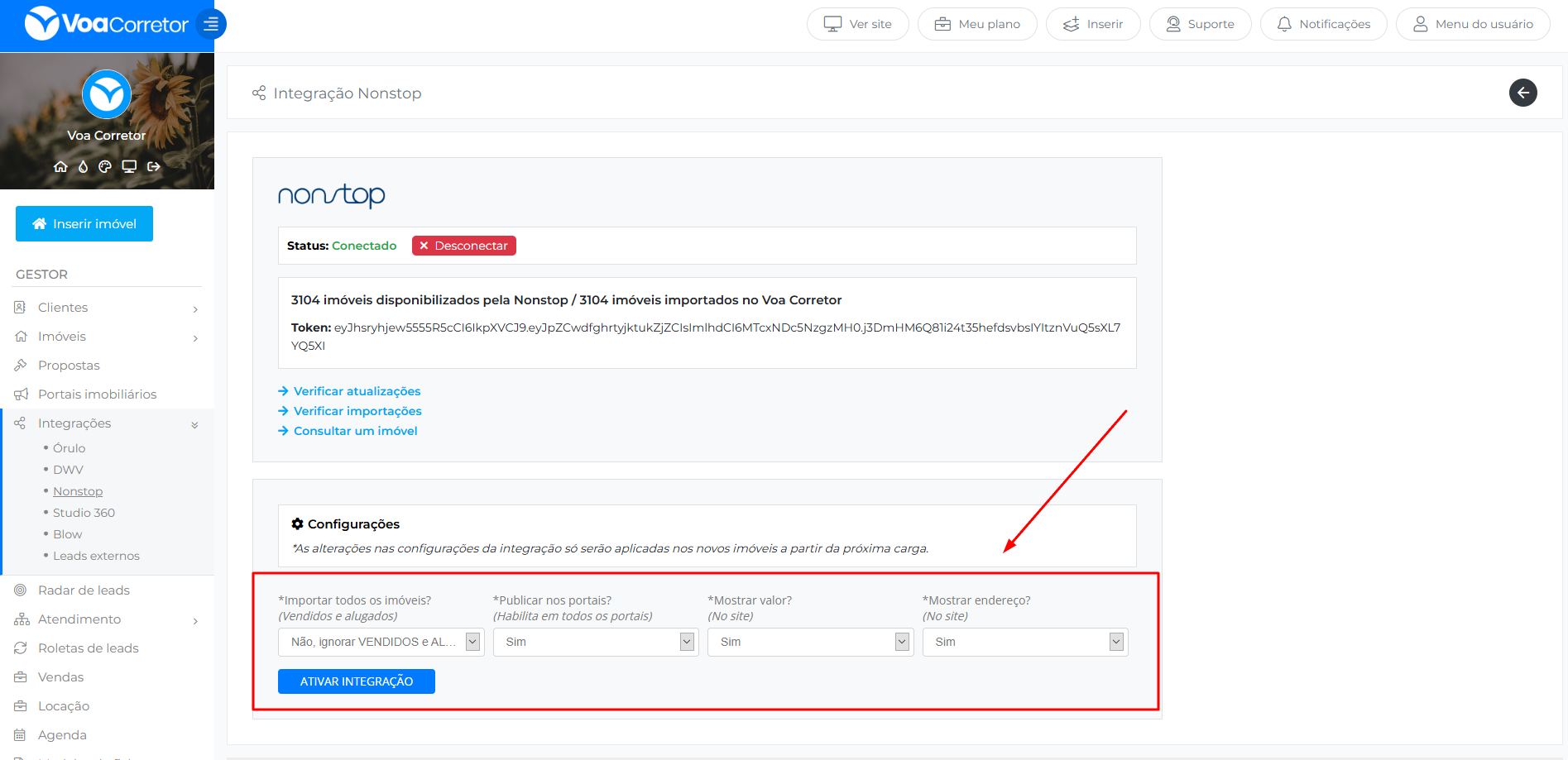No painel do seu sistema no Voa Corretor, acesse o menu Integrações > Nonstop, insira o Token no campo destacado e clique em Conectar.