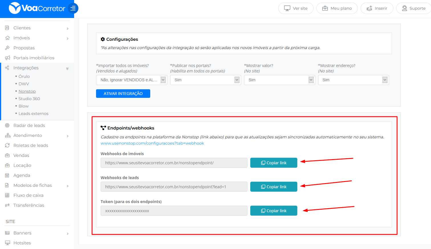 Basta copiar os links disponibilizados no seu painel do Voa Corretor e colar nos respectivos campos na Nonstop.