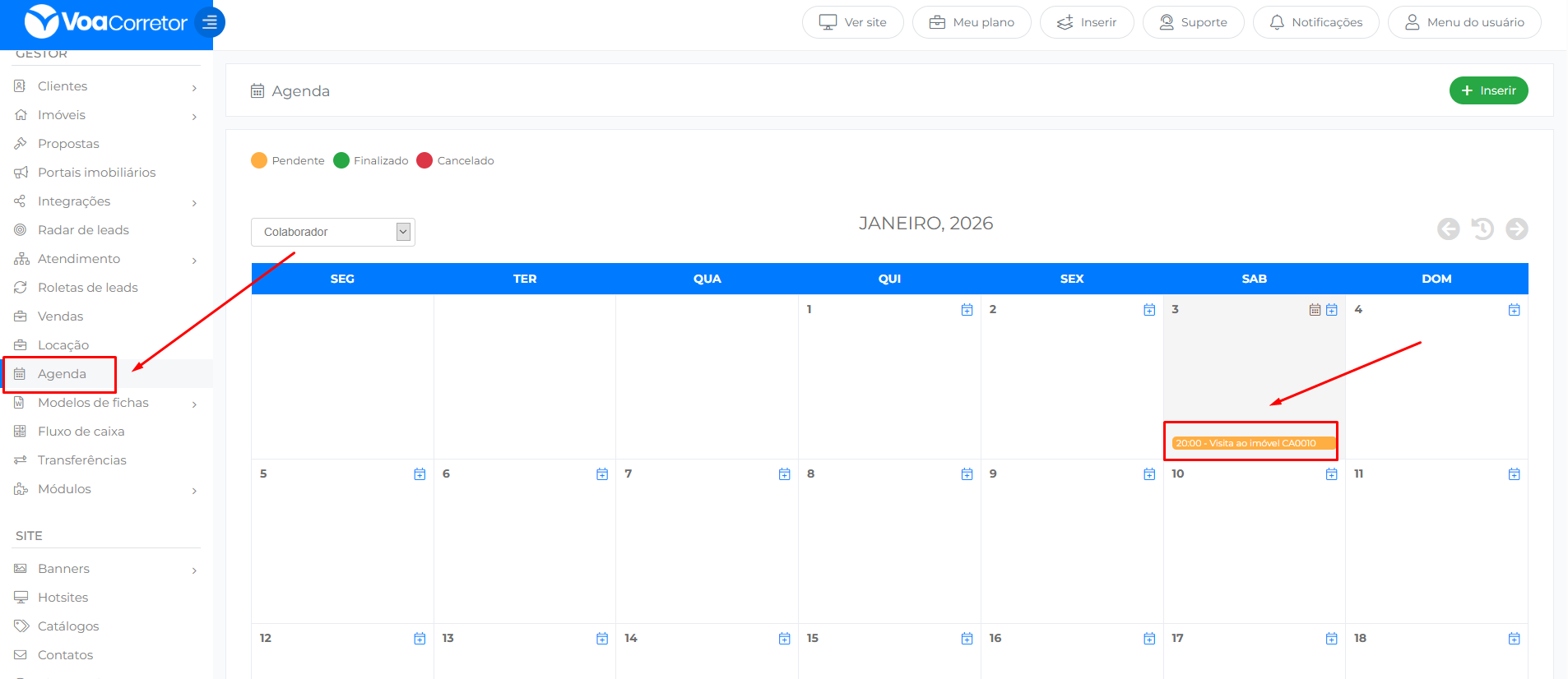 Para inserir os compromissos da agenda, acesse o menu Agenda e em seguida, no compromisso desejado.