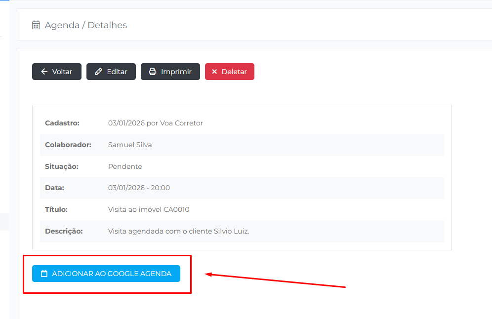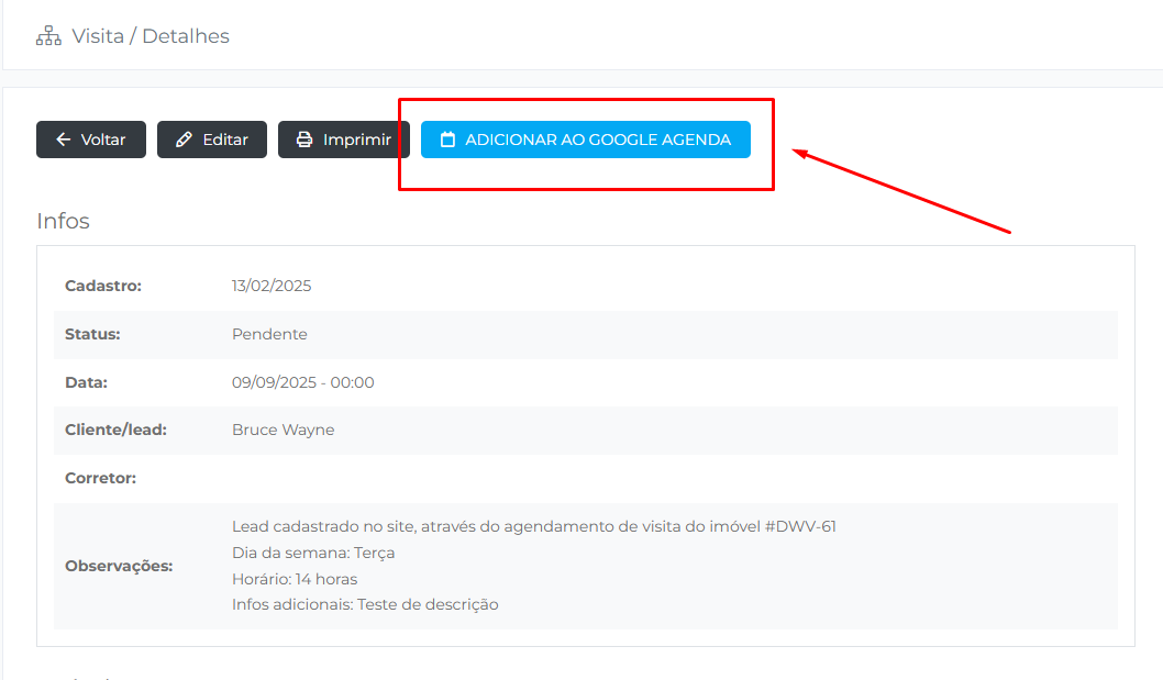 Ao visualizar os detalhes da visita, clique no botão Adicionar ao Google Agenda.