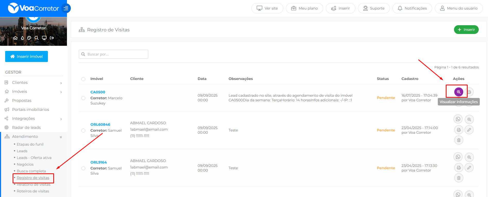 Para inserir os dados de uma visita agendada, acesse o menu Atendimento > Registro de visitas, localize o registro desejado e clique em Visualizar informações.